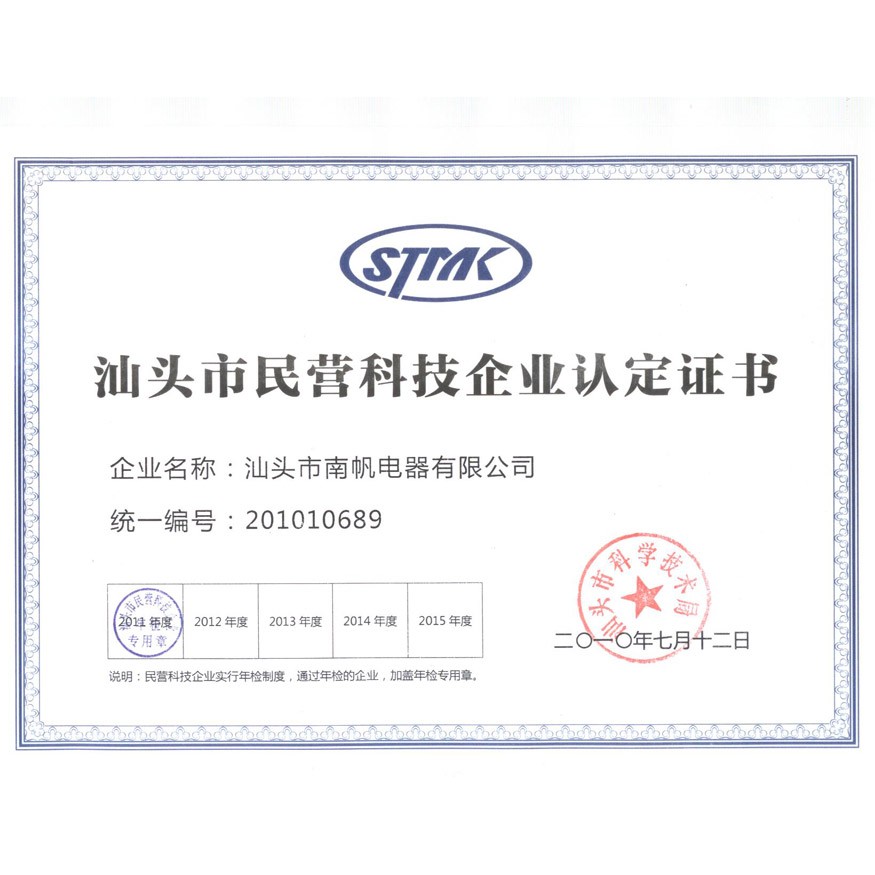 汕頭市民營科技企業認定證書2015年