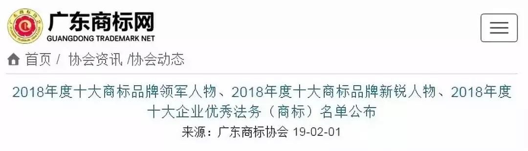 一年一度的新春佳節來臨之際,從廣東商標協會傳來喜訊,經過線上投票及專家評審團評分,確定了2018年度十大商標品牌領軍人物、2018年度十大商標品牌新銳人物、2018年十大企業優秀法務 (商標)名單: