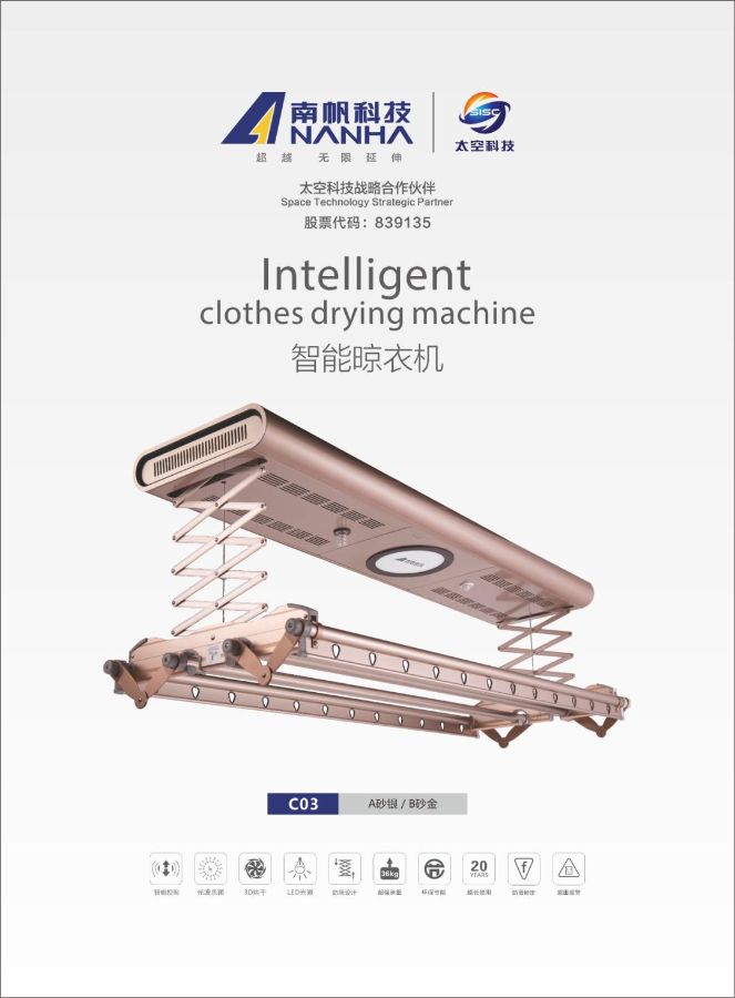 南帆科技智能晾衣機集智能遙控升降、健康照明、光波殺菌、人體感應、3D熱風速干、防風擺設計等功能為一體,獨有十幾項專利技術,為您提供智能+健康衣服晾曬解決方案。